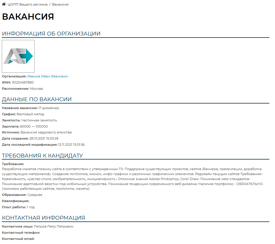 Для подробного просмотра выбранной вакансии необходимо кликнуть по ее названию, откроется новая вкладка на сторонний ресурс или на Карточку вакансии, если она была добавлена при помощи формы на Платформе ЦОПП.