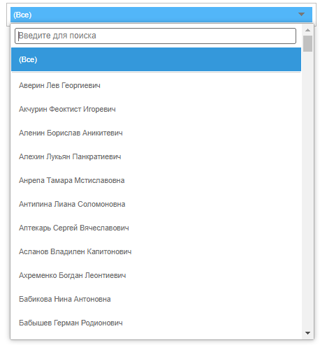 Поле со списком - это элемент фильтрации на панели индикаторов, который предоставляет возможность фильтровать данные для элементов анализа в режиме просмотра, в зависимости от выбранного значения. Этот элемент представляет собой аналог элемента Список, с той лишь разницей, что все значения содержаться в выпадающем меню. Может быть расположен в любом месте на панели индикаторов. В зависимости от размеров панели индикаторов в режиме просмотра, может расти или сжиматься только по ширине.