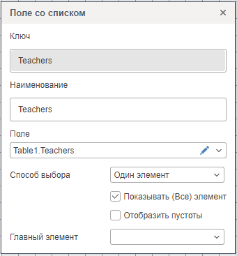Элемент Поле со списком может быть подчиненным по отношению к другим элементам фильтрации, или являться главным элементом фильтрации для них. Элемент Поле со списком может работать в двух режимах выбора: