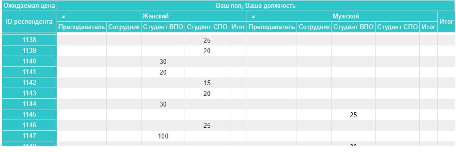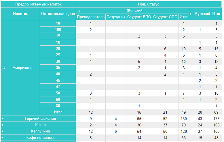 В этом случае, в сводной таблице цена каждого напитка будет отдельной строкой в сводной таблице.