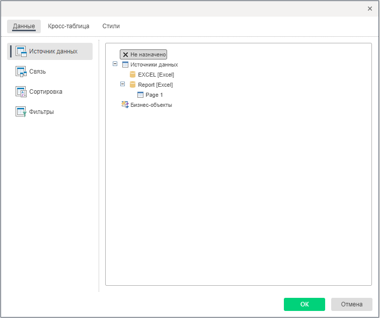 В группе Источники данных отображаются все доступные источники данных. Необходимо определить источник данных, который будет использоваться при создании кросс-таблицы.