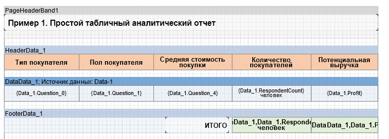 Источник данных фактически представляет из себя таблицу. В каждом источнике данных есть графы данных. Разместив на блоке данных текстовые компоненты со ссылками на эти графы, можно вывести на печать таблицу.