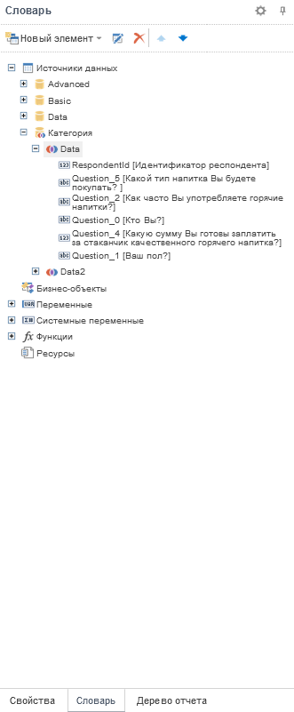 При разработке отчетов и панелей индикаторов все источники данных и их настройки располагаются на отдельной панели в дизайнере отчетов Словарь и Свойства.