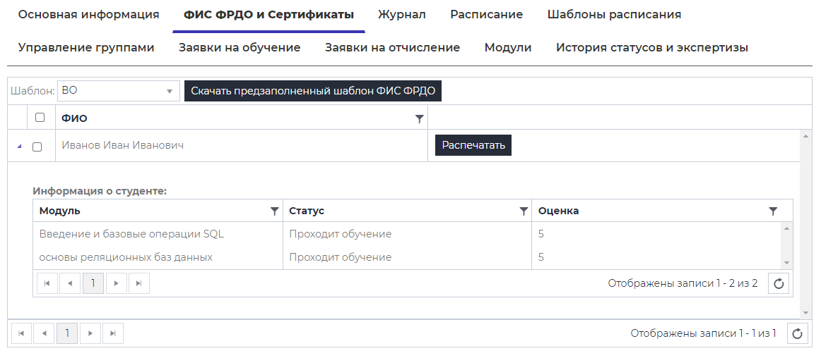 Также на вкладке можно распечатать выданный сертификат отдельного студента, нажав на кнопку .