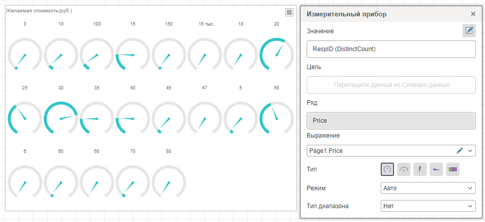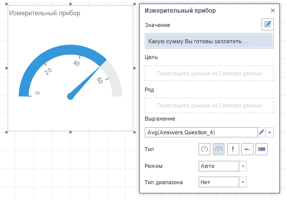 Например, в поле Значение измерительного прибора перетянут из Словаря данных вопрос «Какую сумму вы готовы заплатить?» и в Выражении указано вывести среднее значение (Avg), то без указания рядов будет отображен один графический элемент, значением которого в данном случае будет равняться среднему значению суммы в 46,99 рублей.