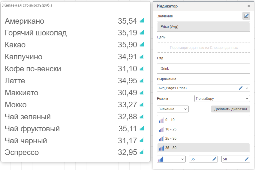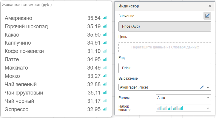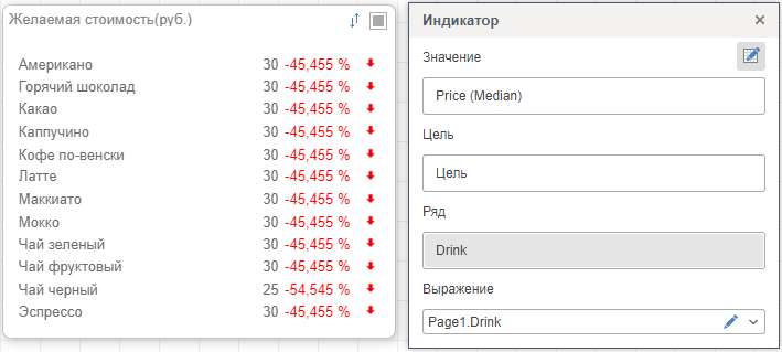 Если в рядах указать поле данных с перечнем напитков, то для каждого из них будет отображен свой индикатор, т.е. по каждому товару будет отображена его предпочтительная стоимость за 1 единицу и значение отклонения для каждого из них.