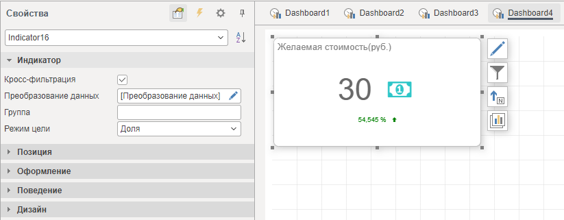 На панели свойств с помощью свойства Режим цели можно выбрать режим расчета целевого показателя индикатора: Отклонение или Доля.