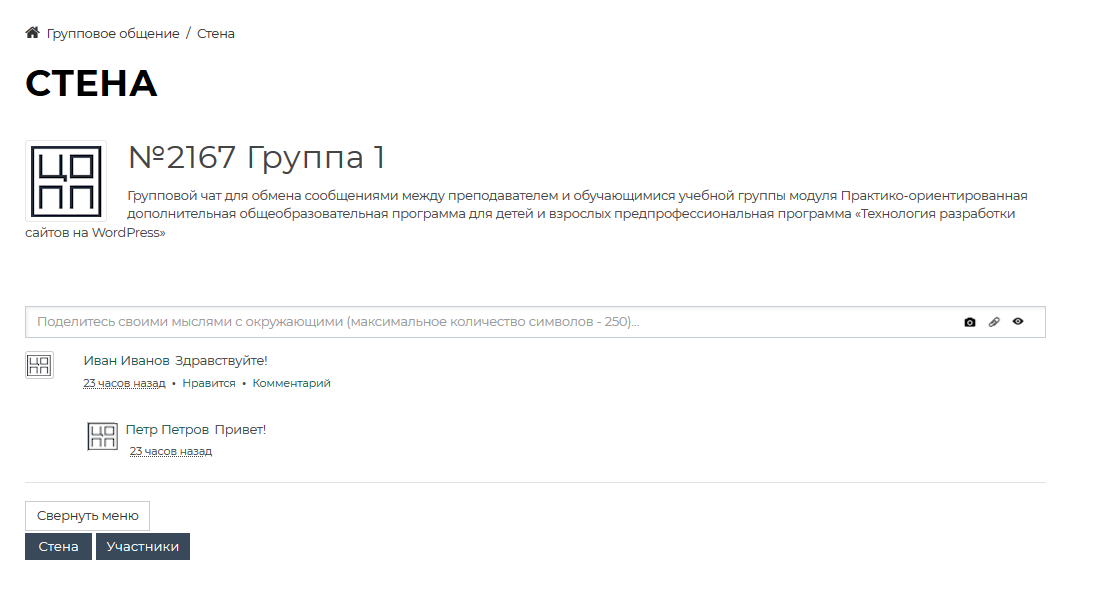 , в котором можно обмениваться сообщениями с преподавателем и обучающимися группы модуля.