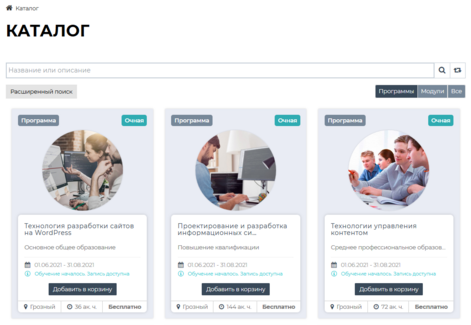 Пользователь имеет возможность ознакомиться с информацией о программе, кликнув по карточке выбранной программы. Загрузится страница с подробным описанием программы и модулями, входящими в её состав. Есть возможность добавить в Корзину все модули программы, нажав на кнопку