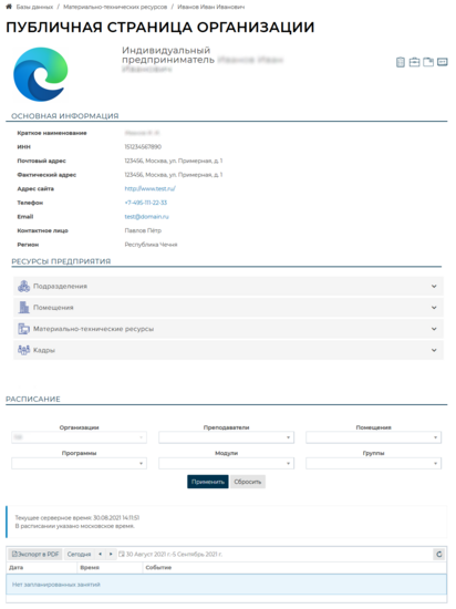 Пользователь может ознакомиться с информацией по организации, предоставляющей обучение по выбранной программе, на ее публичной странице. Для этого необходимо кликнуть по названию организации, откроется новая вкладка с публичной страницей организации.