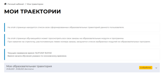 Чтобы просмотреть все свои заказы на обучение и информацию по ним, нужно перейти по ссылке в сообщении в самой корзине, либо на страницу «Индивидуальные образовательные траектории», выбрав в меню пользователя