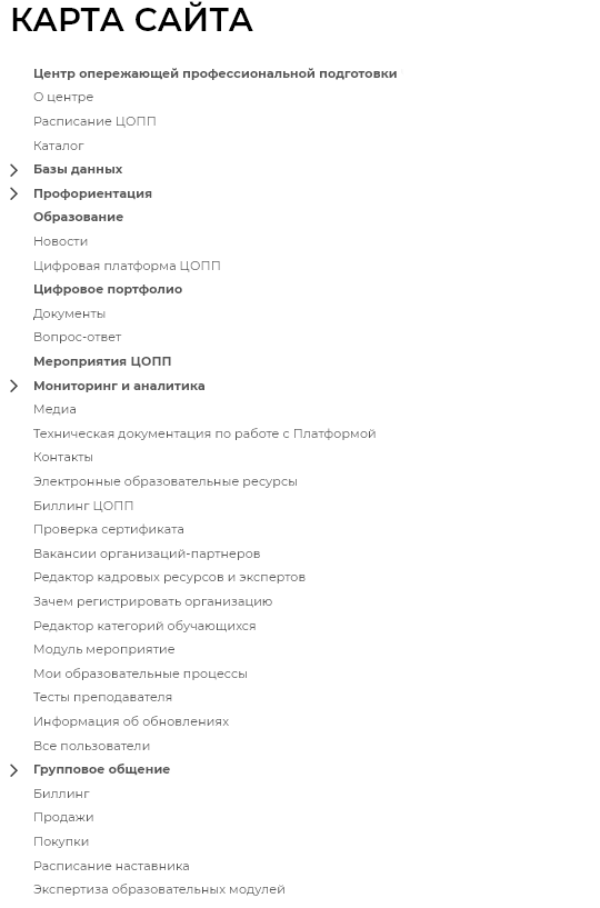 Динамически создаваемая карта сайта отображает в древовидном виде полную структуру Платформы.