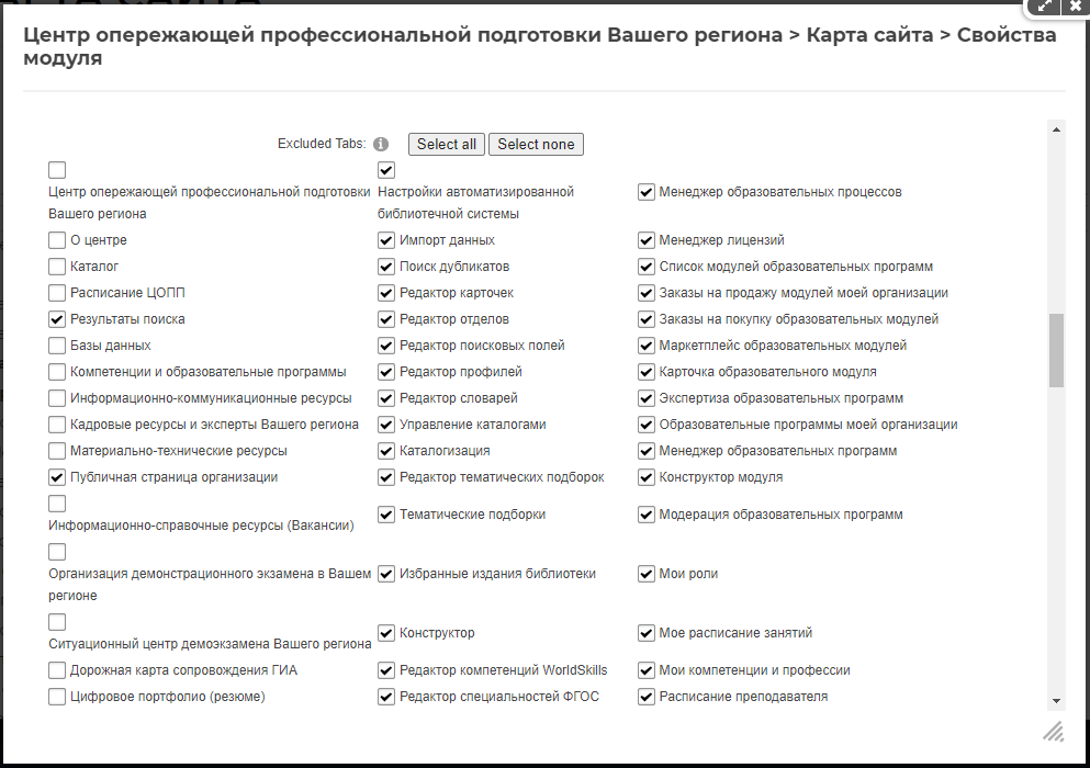 В настройках карты сайта есть возможность добавить или скрыть какие-либо страницы и разделы Платформы, поставив галочки напротив соответствующих страниц в разделе Исключенные вкладки. Остальные настройки ставятся по умолчанию, при необходимости их можно изменить.