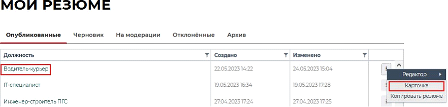 , находящуюся справа от каждой записи в перечне резюме и выбрать пункт [Карточка], либо нажать на название должности в перечне резюме.