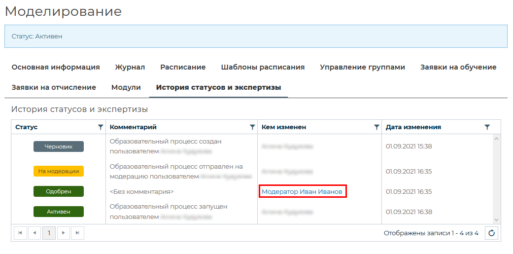 Чтобы связаться с модератором, одобрившим/отклонившим процесс, необходимо нажать на кликабельную ссылку в поле «Кем изменен». Далее написать сообщение.