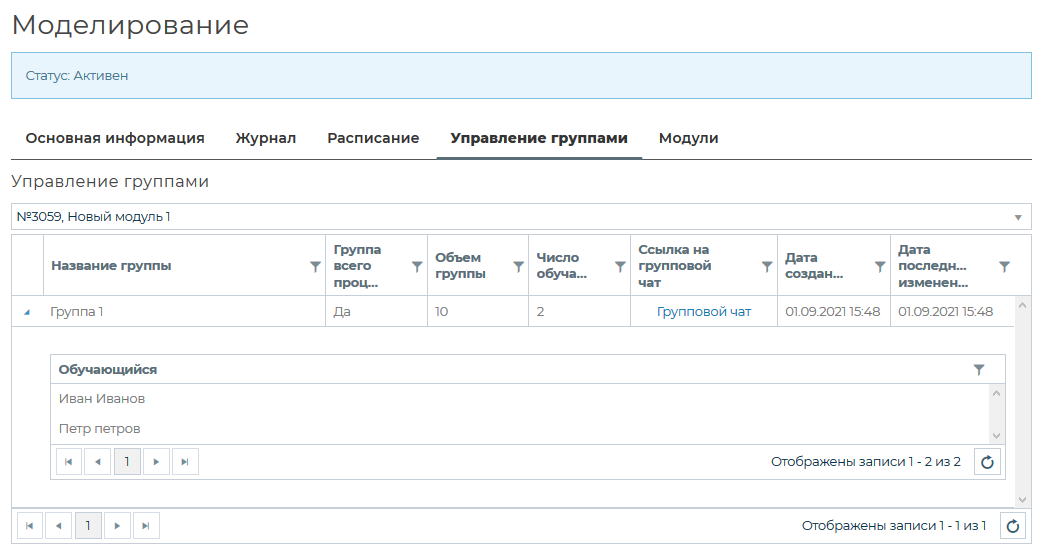 Для просмотра списка обучающихся групп необходимо перейти на вкладку «Управление группами» и нажать на стрелку