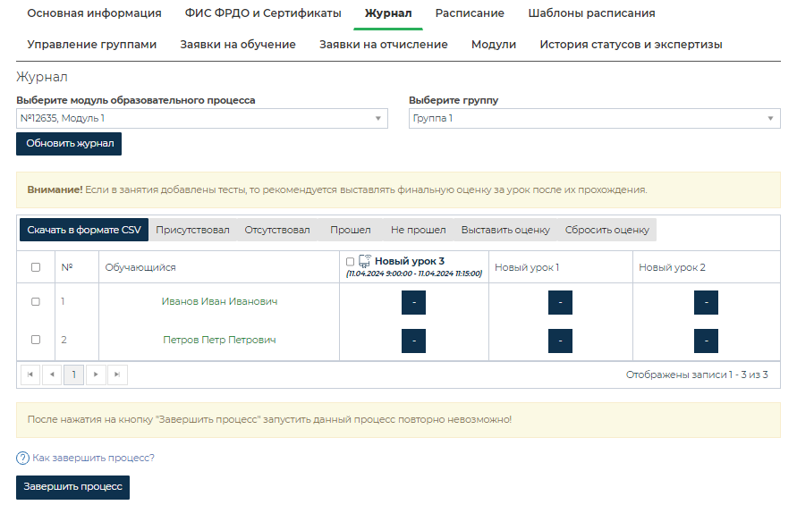 Преподаватель, ответственный за процесс, может осуществлять только просмотр журнала.