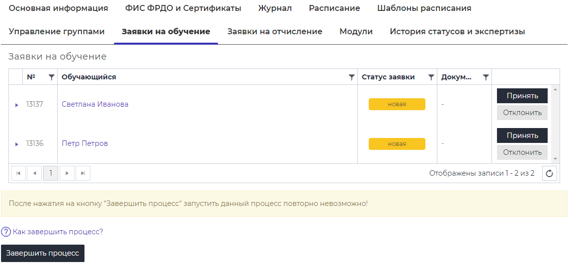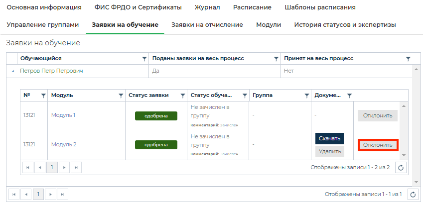 Заявку на обучение можно принять или отклонить. Для этого нужно нажать на соответствующую кнопку напротив каждого из модулей.