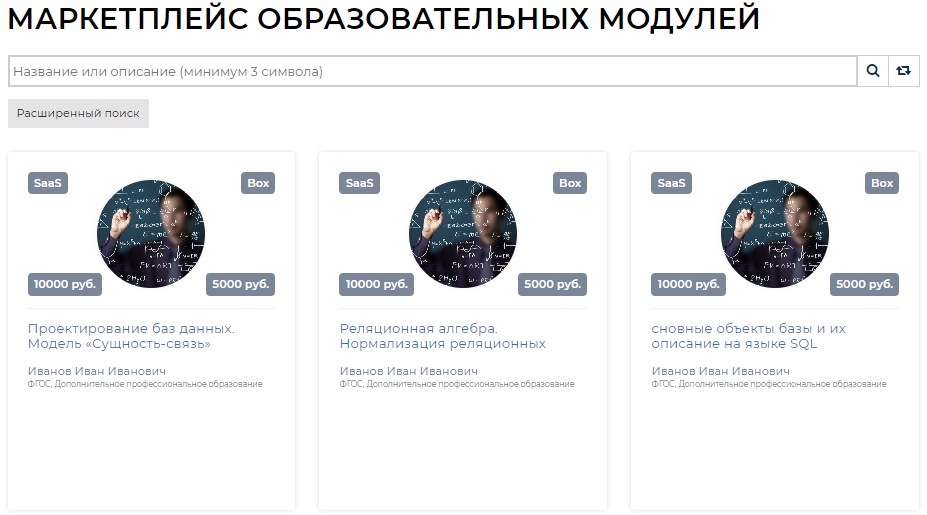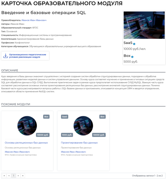 Модель дистрибуции SaaS - привлечение организации-владельца модуля к проведению образовательного процесса по модулю «под ключ» (найм подрядчика). Купленный модуль по модели SaaS можно использовать только в рамках одной образовательной программы. Для его добавления в другие образовательные программы, его необходимо приобрести повторно в Маркетплейсе. Цена указывается за одного обучающегося, в рублях.