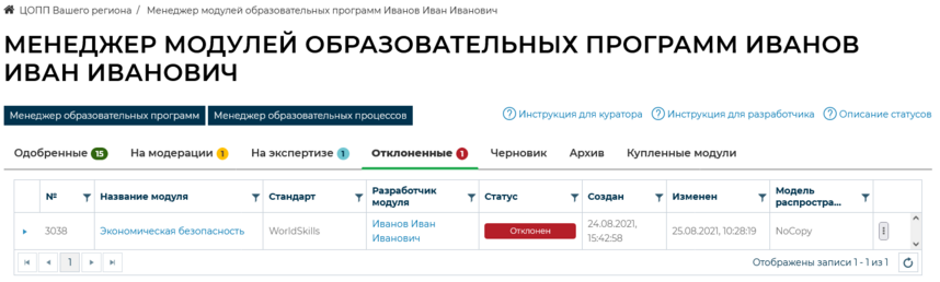 Менеджер модулей образовательных программ. Вкладка «Отклоненные»