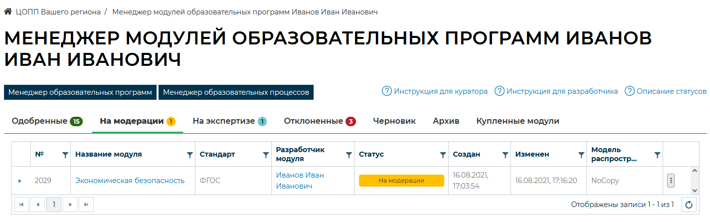 Менеджер модулей образовательных программ. Вкладка «На модерации»