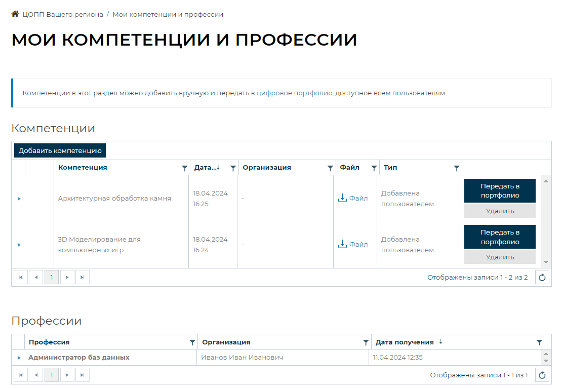 «Мой профиль» в разделе «Мои компетенции и профессии» пользователь может добавить вручную и передать в Цифровое портфолио документ подтверждающий его компетенции.
