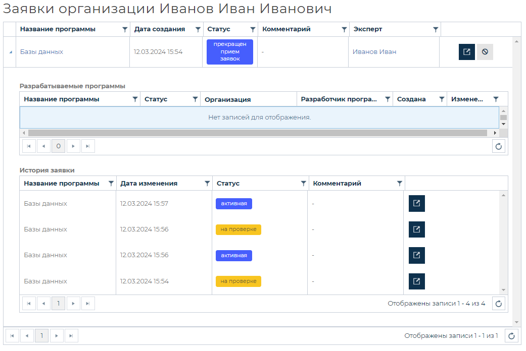 Для просмотра дополнительной информации по заявке необходимо нажать на флажок слева от заявки .  Здесь отображается информация о разработанных программах по данной заявке, а также история заявки.