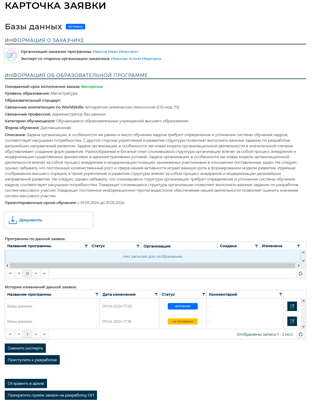 Чтобы подробнее изучить заявку на разработку, нужно нажать на название заявки или на кнопку . После чего открывается новая вкладка с Карточкой заявки. На этой странице можно сменить эксперта , приступить к разработке , отправить заявку в архив и прекратить прием заявок .