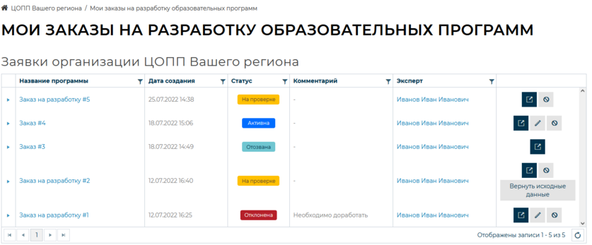 На предыдущей вкладке браузера на странице «Мои заказы на разработку образовательных программ», напротив отредактированной заявки появляется кнопка . При нажатии на нее возвращается информация, которая была в заявке до того, как она была отредактирована. Также статус меняется с на .