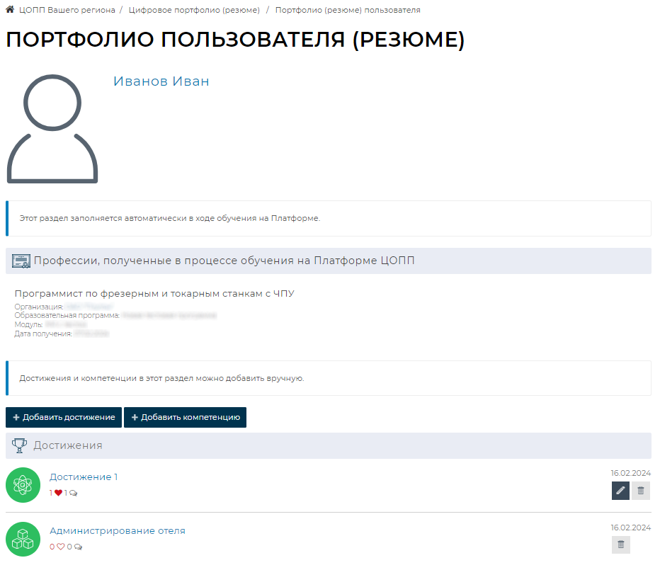 обучающегося для всех зарегистрированных и верифицированных пользователей Платформы. В нем отражены профессии пользователя, которые он получил в ходе обучения на Платформе. Также обучающийся может добавлять новые достижения и компетенции самостоятельно.
