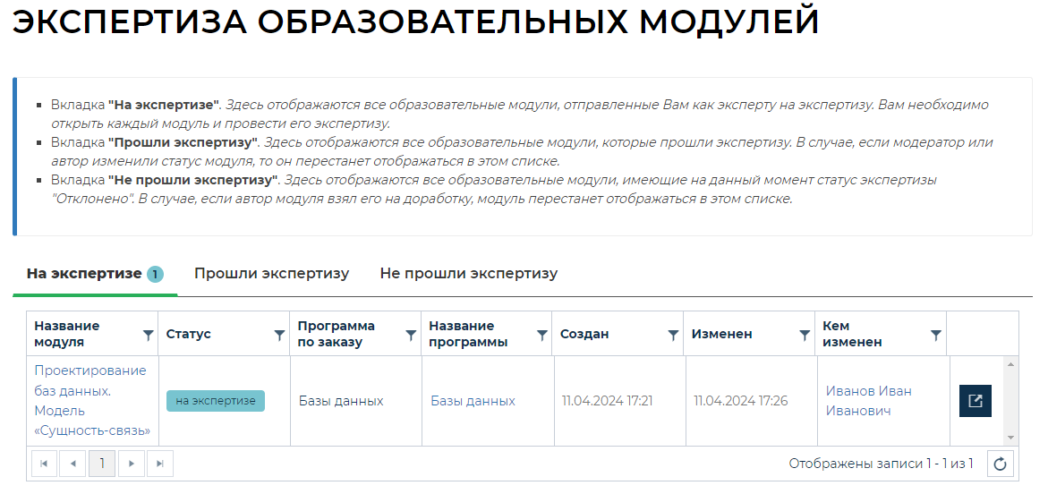 • Вкладка «Прошли экспертизу». Здесь отображаются все образовательные модули, которые прошли экспертизу. В случае, если модератор или автор изменили статус модуля, то он перестанет отображаться в этом списке.