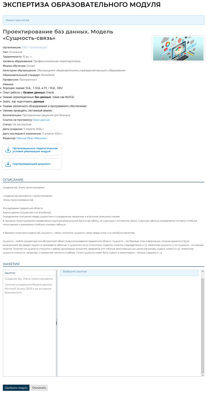 Для того чтобы одобрить или отклонить образовательный модуль, необходимо нажать на кнопку [Карточка] .