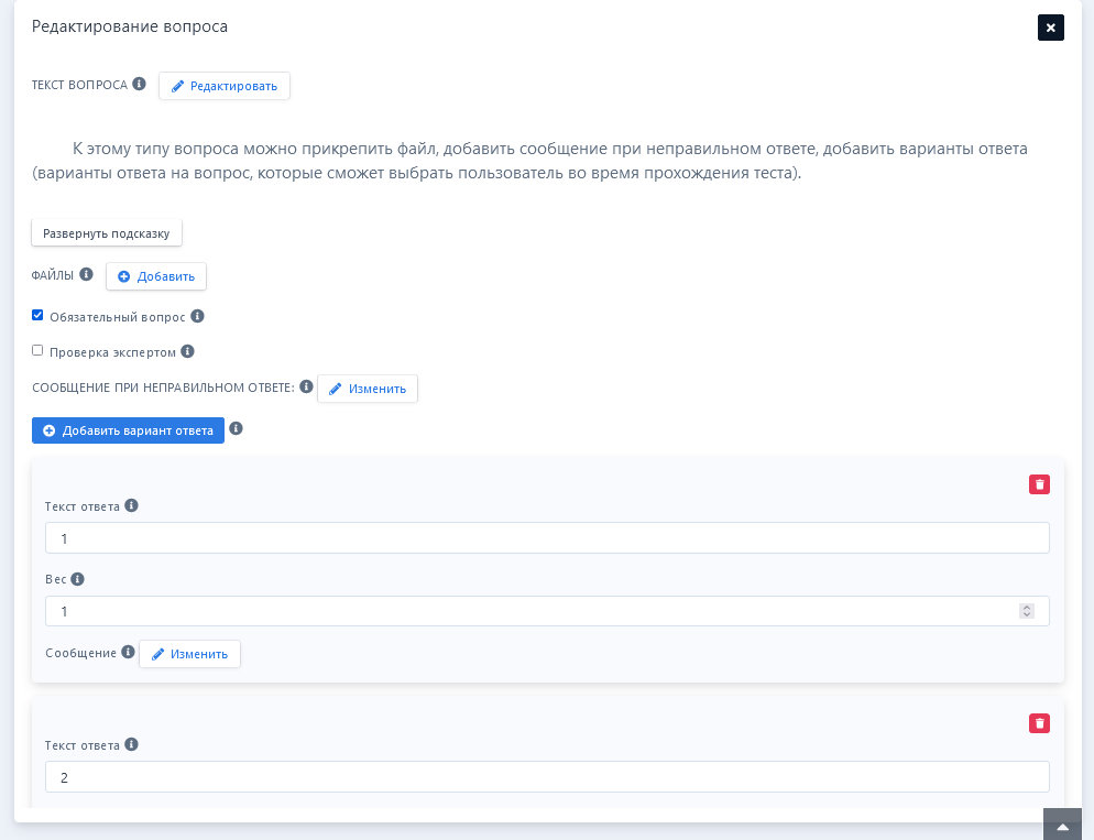 К этому типу вопроса можно прикрепить файл, добавить сообщение при неправильном ответе, добавить варианты ответа (варианты ответа на вопрос, которые сможет выбрать пользователь во время прохождения теста).