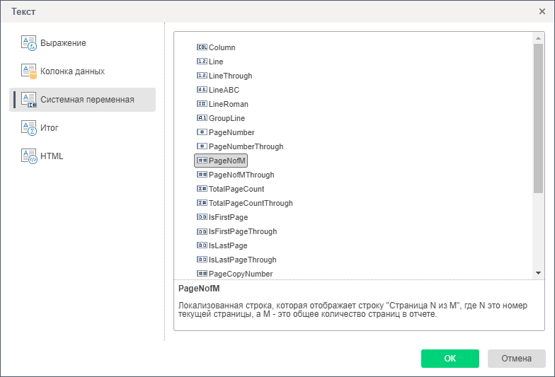 Нумерация страниц является системной переменной, код которой можно указывать во вкладке Выражение: