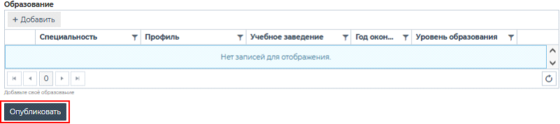 После того, как пользователь заполнил все необходимые поля в процессе создания или редактирования резюме, его необходимо опубликовать в каталоге. Для публикации резюме необходимо нажать кнопку [Опубликовать], расположенную ниже полей конструктора резюме.
