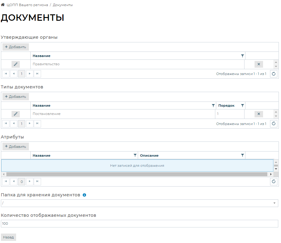 В настройках «Папки для хранения документов» Администратором задается папка из файлового менеджера, для хранения и загрузки документов для всего модуля.
