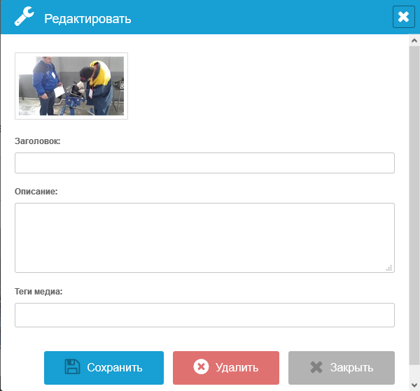 Для редактирования изображения необходимо нажать иконку редактирования («карандаш») рядом с изображением. Загрузится всплывающее окно редактирования, где возможно изменить название, описание и тэги изображения, а также удалить изображение, нажав кнопку «Удалить».