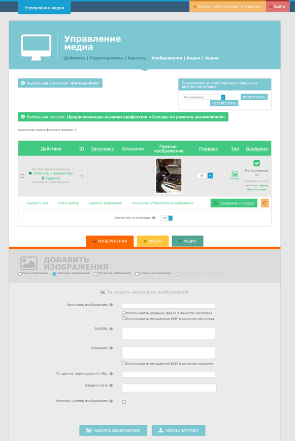 Управление контентом (добавить/редактировать медиа) – добавление, редактирование и удаление категорий, галерей и элементов (изображения, видео и аудио).
