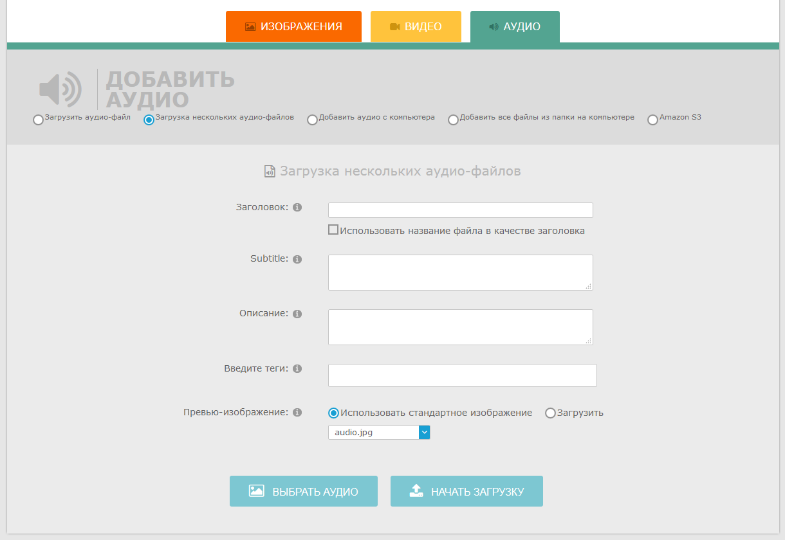 Для добавления нового медиа-файла необходимо выбрать нужную вкладку (изображение, видео, аудио), расположенную под таблицей с файлами, заполнить поля формы добавления, нажать кнопку «Выбрать изображение» (для изображений) / «Выбрать аудио» (для звуковых дорожек) и нажать кнопку «Начать загрузку».