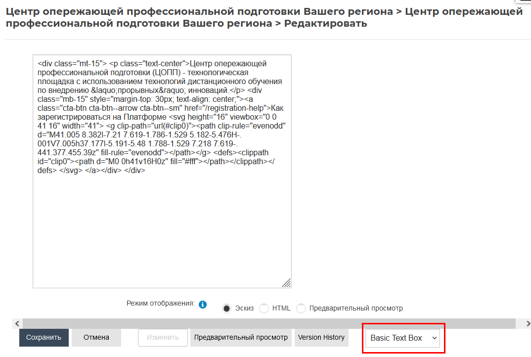 Иногда нужен бывает код форматированного текста. Для это нужно выбрать режим просмотра Basic Text Box (под редактором).
