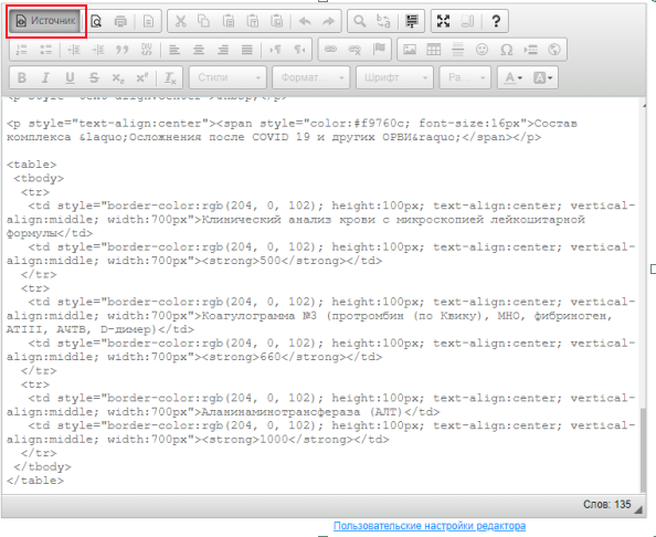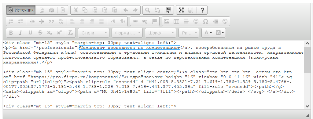 Если необходимо отредактировать текст в уже добавленном и сформированном фрагменте HTML-коде, то лучше всего не удалять информацию полностью, а перейти в Источник (HTML-редактор) и заменить необходимы текст.