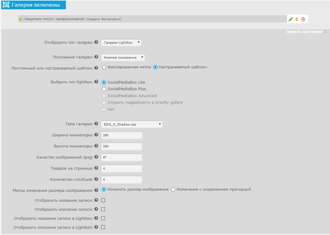 Настройки галереи при создании новостной статьи