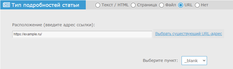 В разделе «Тип подробностей статьи» выбрать «URL» и в появившемся поле ввода указать ссылку на профориентационные видеоролики.