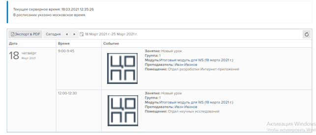 В модуле отображается календарный период (неделя), дата, время и событие, происходящее в этот день. С помощью стрелочек можно посмотреть расписание мероприятий прошедшей и следующей недели .
