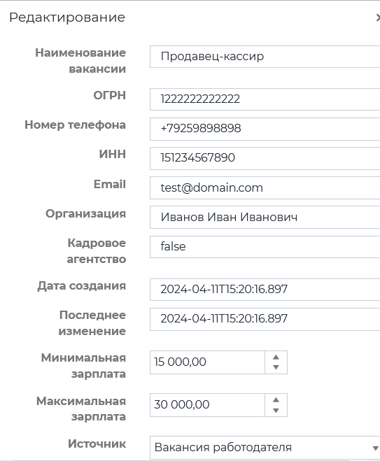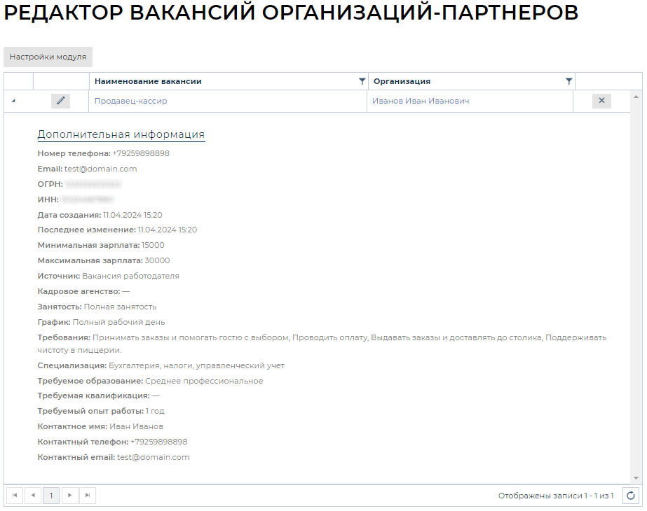 Администратору и модератору доступно редактирование вакансий организаций-партнеров из меню ЛК Администратора пункт Редактор вакансий партнеров.