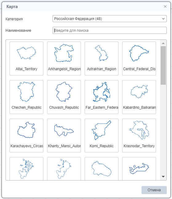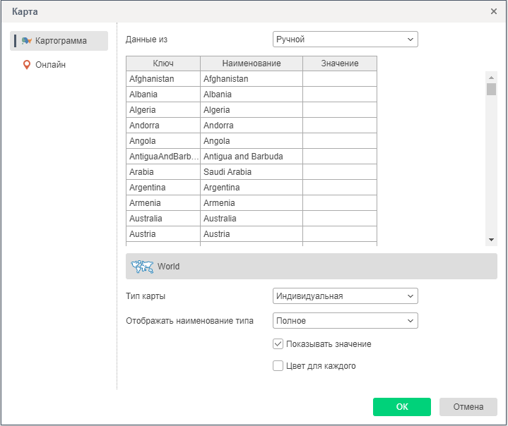 Картограмма - предоставляет возможность отобразить какое-либо значение с привязкой к географическому объекту (область, регион, страна, часть света и т.д.).