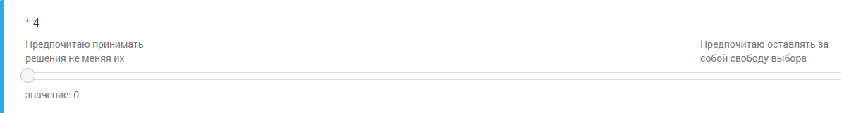 Данный тип вопроса применяется для выбора ответа с помощью специальной шкалы значений, задаваемых автором анкеты.