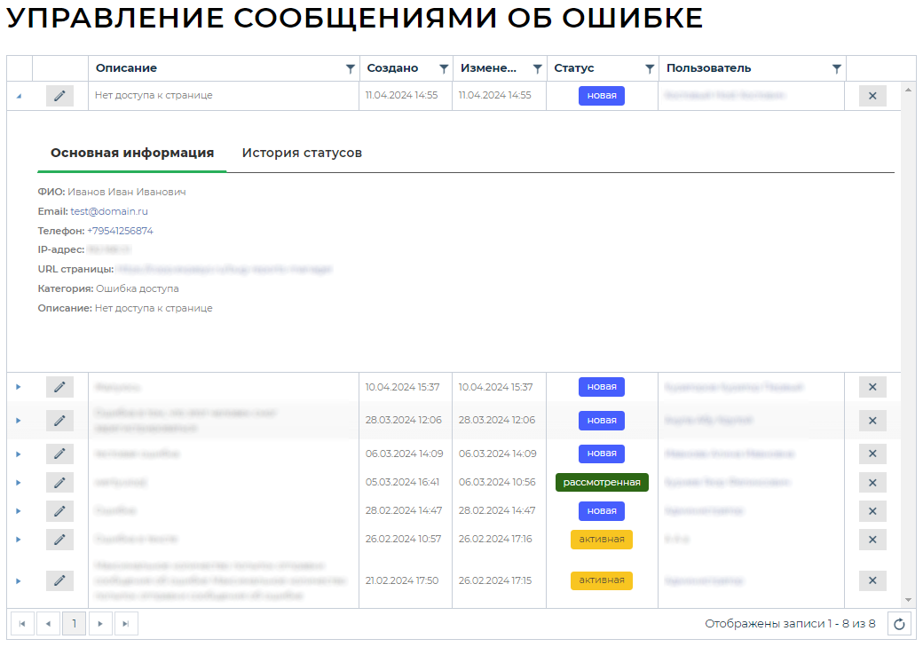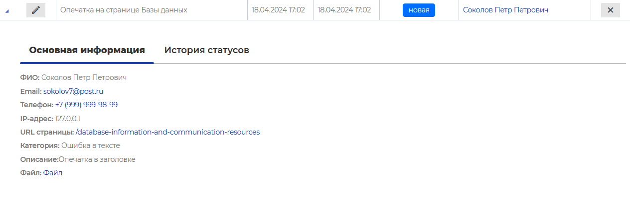 . Изменить статус на «Активная», если ошибка на рассмотрении, или «Рассмотренная», если ошибка была рассмотрена и исправлена.