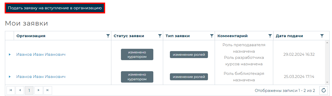 По умолчанию, пользователь получит роль – Сотрудник. Далее необходимо дождаться одобрения заявки куратором организации.