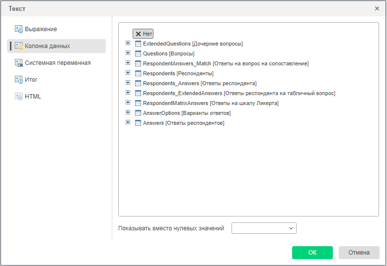 Вкладка представлена одной панелью, на которой отображаются только колонки данных из Источника. При выборе колонки будет сформировано выражение, которое представляет собой ссылку на описание данной колонки в Источнике данных отчета. Также в данной вкладке, присутствует параметр Показывать вместо нулевых значений, при помощи которого можно указать символы, которые будут отображаться вместо нулевых значений выбранной колонки данных. На примере выше, вместо нулевых значений выбран прочерк.